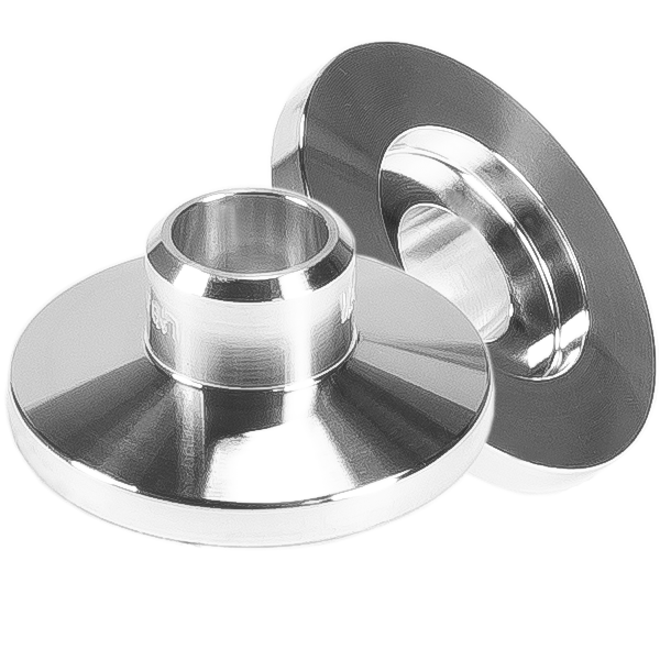 These 1/2 inch OD KF-16 Half Nipple Short Weld Stub fittings follow ISO-KF standards and have a flange size of NW-16. They are commonly used to build foreline vacuum plumbing and process systems. They are often called quick flange fittings because they are quick to assemble. A circumferential clamp and centering ring form the vacuum seal between the connecting flanges. The centering ring contains a rubber elastomer o-ring. The standard sizes for quick flange fittings are KF-10, KF-16, KF-25, KF-40, and KF-50 with flange sizes NW-10, NW-16, NW-25, NW-40, and NW-50, respectively. They are made of Aluminum.